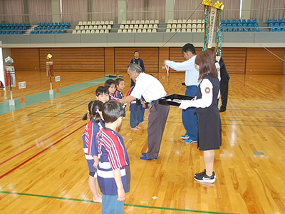 次に、各園の代表に幼年消防クラブワッペンが贈られ、そのお返しとして、来賓者に対し、防火の誓いを込めたクラブ員手作りのレイがプレゼントされました。