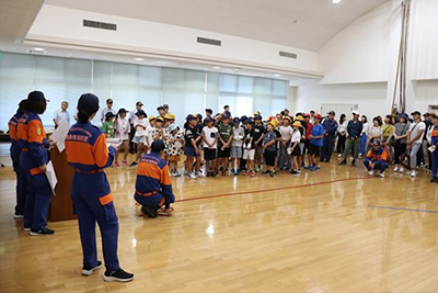 各クラブ員たちは、会場に到着すると、消防車両との記念撮影や放水体験を行ったあと、体育館内で整列して式典に臨みました。