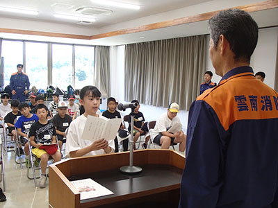 この研修会は、少年期における防災教育の一環として、消防への理解と関心を深めることを目的に開催しました。研修会には、雲南消防本部管内の14クラブから35名の参加がありました。当日はとても暑い中での研修会でしたが、熱中症やケガもなく、防火・防災について色々な体験をしました。