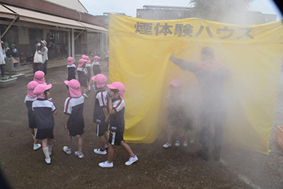 普段近くで見ることのないはしご車を間近で見学し、はしご車上から先生の飛ばした紙飛行機を喜んで見守っていました。煙体験を経験した園児たちからは、「前が見えなかった」、「怖かった」といろいろな感想が寄せられました。
