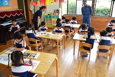 幼年消防クラブは、防火・防災思想の普及を目的として「消防車両との記念撮影」や「はしご車の見学」、「煙体験」を行い、5歳児は消防車両見学後、教室にて「消防ぬり絵」も行いました。