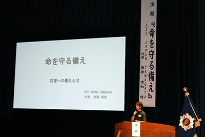 研修では、DRT JAPAN YAMAGATA(技術系ボランティア団体)代表の我妻清和様を講師に招き『命を守る備え』と題して講演をいただきました。参加者は「自分の命は自分で守る」、「共助」などについて講演をいただき、真剣に聞き入っていました。住宅用火災警報器についても講話され住宅用火災警報器の重要性について、再認識されたようです。講演の最後には『災害に負けない地域創りのため、今こそ本気で向き合うべき』という言葉に、参加者全員が感銘を受けた講演でした。