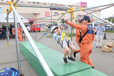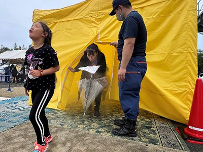 今年度は悪天候のため、消防演習・消防団員技能競技大会との同時開催とはなりませんでしたが、午後から雨がやむとの予報を受け、雨の中、イベントを開始しました。予報通り昼から雨はやみ、無事に開催することができました。