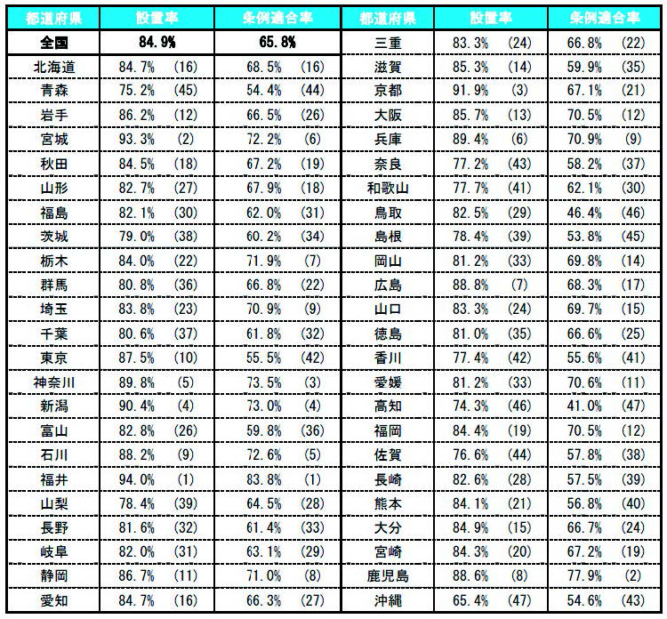 都道府県別に見ると、福井県の設置率(94.0%)と条例適合率(83.8%)が最も高く、一方で、沖縄県の設置率(65.4%)と高知県の条例適合率(41.0%)が最も低くなっています(表参照)。