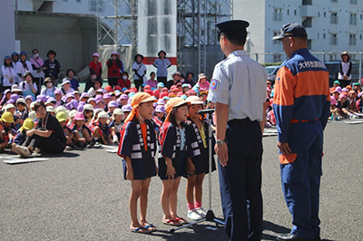 市内の幼年消防クラブ21クラブ、来賓その他関係者を含む600名が参加し、消防職員による仕事紹介、火災映像の上映や〇×クイズによる防火啓発が実施されました。大会の終盤では、園児たちによる「防火の誓い」が元気いっぱい唱えられ、火遊びをしないことを約束してくれました。