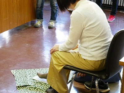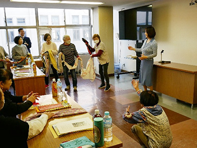 その後の実演講座では、大きさの違う風呂敷2枚を使用して作成するリュックサックやウエストポーチのほか、大きな風呂敷と厚紙などを使用してどんな足のサイズにもフィットする靴を作成するなど、女性防火クラブ員の皆さんは熱心に受講していました。