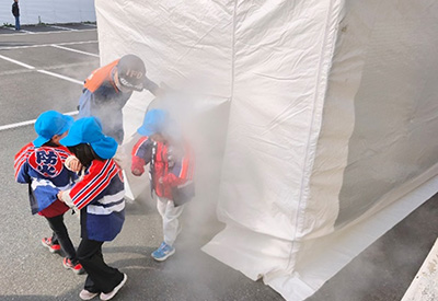 一関文化センターでは、「消防広場」として屋外に各種体験コーナーを開設。クラブ員の園児たちは消防車・救急車の乗車体験や煙体験、水消火器による放水などを通じて、消防の仕事や煙の恐ろしさ、避難の仕方などを学んでいました。