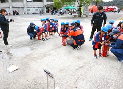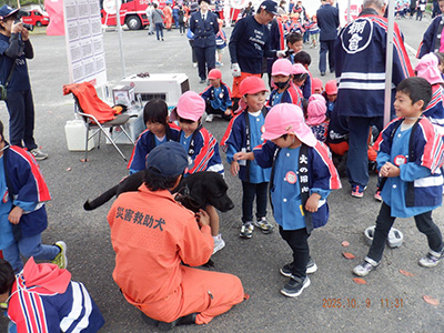 第2部は「防火フェスティバル」と称し、消防体験(放水体験や水消火器体験、地震体験、煙体験)、ミニ消防車・ミニ救急車に乗車や災害救助犬とのふれあいをとおし、火遊びによる火災の防止と消防とのふれあいにより防火防災について学びました。