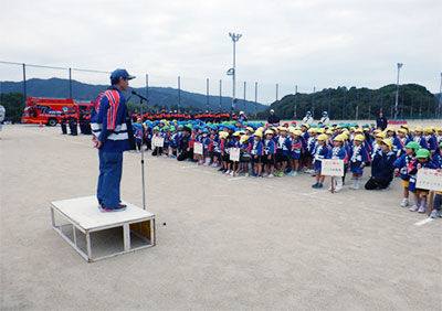 この大会は、もともと幼年消防クラブ員の健全育成を目的として始まったもので、その結果、近年、管内では子どもの火遊びが原因の火災は発生しておりません。これからも地域を巻き込んで防火意識の高揚に努めます。