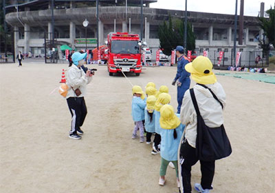 第1部の式典のあと、第2部では幼年消防クラブの防火演技が優雅にまた力強く披露され、会場からは大声援が送られました。大会終了後には、園児たちは消防車両をバックに記念撮影、煙体験コーナーなどもしました。