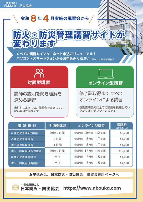 日本防火・防災協会では、防火管理者・防災管理者の資格を取得するための講習を行っております。 令和8年4月から、講習サイトをリニューアルします。 新しい講習サイトは、こちら(https://www.nbouka.com/)です。 当初から行っていたFAXによる申込みを廃止し、インターネットによる申込みのみとなりましたので、ご注意ください。