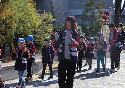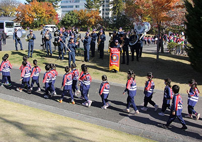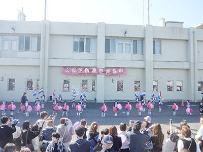 その後、会場の外に移動し多くの方々が見守る中、まといや拍子木を持ち、大きな声で「火の用心 マッチ一本火事の元」「火遊びしません 火の用心」と呼びかけながらパレードをしました。 火災予防について、楽しく学べた1日となりました。