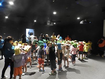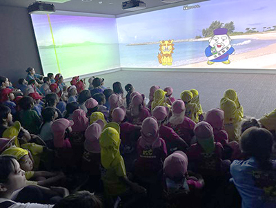 名護市防災研修センターでの防火ビデオ視聴。アニメ映像での火・煙の恐さを学び火遊び防止の教育を行いました。