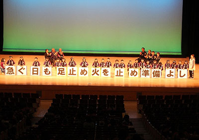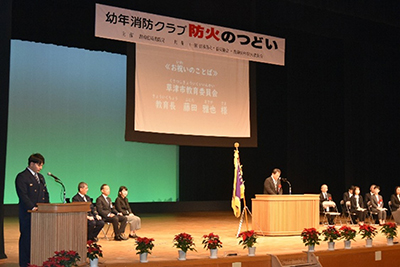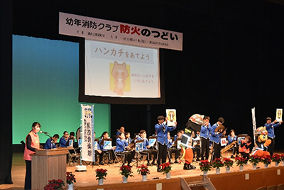 群馬音楽センターで開催した式典では、園児たちによる「幼年消防クラブ三つの誓い」の宣言、消防音楽隊の演奏に合わせて火の用心の歌などを元気よく歌い踊りました。