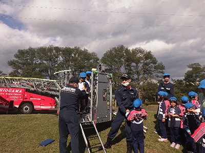 七ヶ浜町内の6施設が合同で令和7年10月27日(月)に「七ヶ浜サッカースタジアム」で開催し、「火の用心のうた」や「防火のちかい」を元気いっぱいに参加クラブ員全員で消防職員や保護者に披露した他、消防車との記念撮影や消防資器材の見学、はしご車への搭乗体験を通し防火・防災への興味を深めてもらいました。