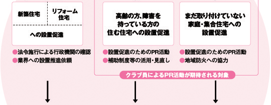 クラブ員のみなさんによって、火災警報器をつけることが、地域に『あたりまえ』となっていくためには、さまざまな関係団体と協力して推進していく必要があります。次のような体制のなかで、クラブ員のみなさんには「高齢の方、障害を持っている方」「まだ火災警報機を取り付けていない家庭・集合住宅」といった方へのPRが期待されています。